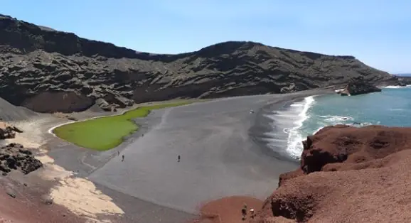 The beach of Laguna de los Ciclos is another beach to visit in Lanzarote if you like picturesque landscapes. On this beach there is a nice contrast between different colors, naturally occurring in the different elements. The black sand that forms the beach contrasts with the reddish color of some of its rocks, and with the green of a strange lagoon that is located within the sands of the beach.